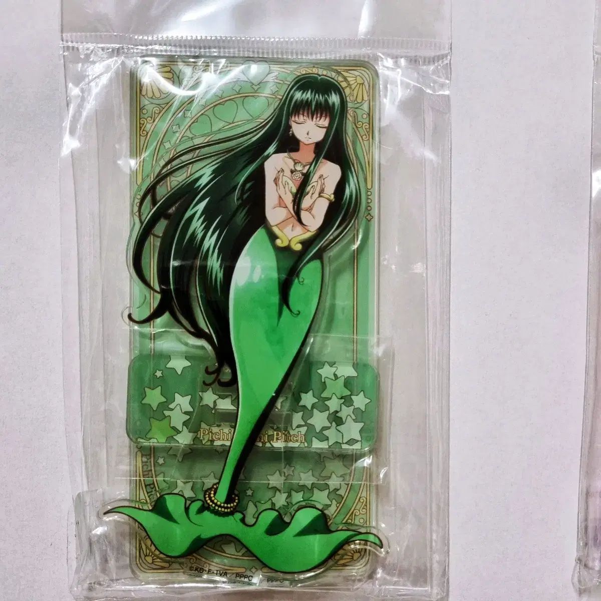これはピッチピーチピッチアクリルスタンド3個セットです。これは新品の未開封商品で、OPP包装にそのまま保管されています。アクリルスタンドの特性上、残留物に敏感な方は購入を避けてください。
